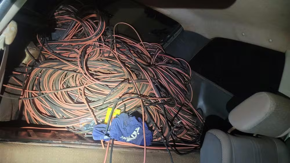 Os outros três suspeitos que permaneceram no veículo foram abordados e detidos. Dentro do carro, os policiais encontraram cerca de mil metros de fios de cobre, três alicates de grande porte, possivelmente utilizados para o corte da fiação, além de dois aparelhos celulares.